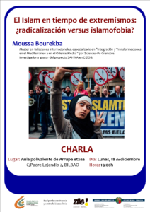 El islam en tiempo de extremismos:¿radicalización versus islamofobia? con Moussa Bourekba, investigador y gestor del proyecto SAHWA en CIDOB, financiado por la Comisión Europea, que pretende analizar las tendencias y perspectivas de los jóvenes en los países árabes mediterráneos.