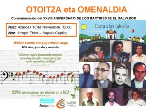 Con motivo del XXVIII aniversario del martirio de la comunidad jesuita de la UCA en El Salvador, os invitamos a hacer una pausa como Arrupe Etxea a las 12:00h para conmemorar la vida y legado de esta gente buena que nos sigue animando en la misión.