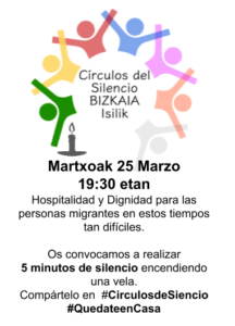 Os invitamos a realizar el gesto de encender una vela mañana día 25 a las 19:30, en el lugar que quieras, y realizar 5 minutos de silencio. Si quieres y puedes, lo compartes en las redes sociales con la etiqueta #CirculosdeSilencio.  Estaremos en toda Bizkaia  realizando el mismo gesto.