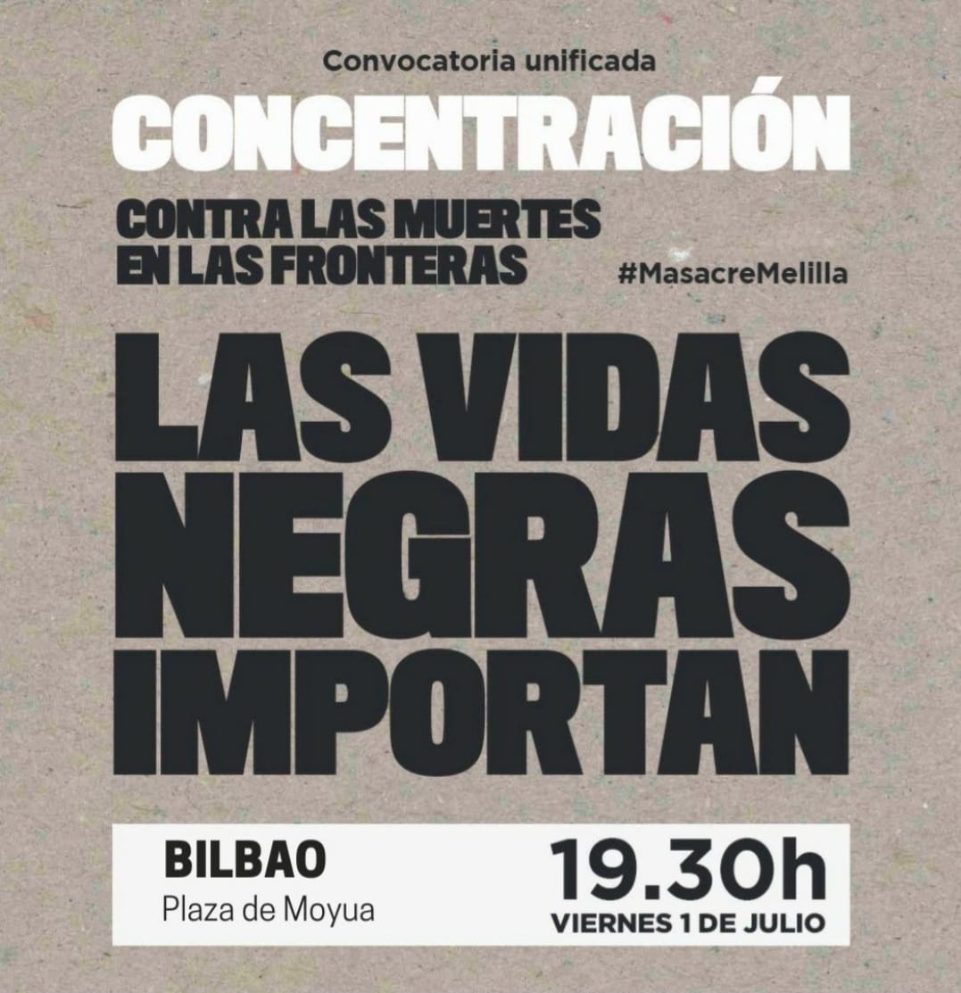 Este viernes 1 de julio hay convocada una concentración unitaria contra las muertes de la frontera de Nador-Melilla y de todas las fronteras en general, con el lema «Las vidas negras importan«. Será en la Plaza de Moyua a las 19.30h.