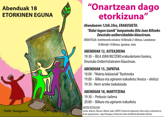En el marco del Día Internacional de las Personas Migrantes, os invitamos a la actividad que se realizará el día 18 a las 19:30 en los Tinglados del Arenal – Bilbao (Mercado de Flores) con un taller de percusión, concentración y lectura de un manifiesto. Os esperamos!!