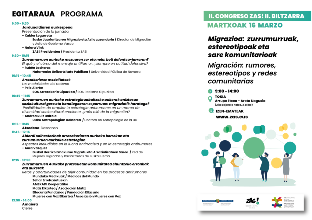 Bajo el título: «Migración: rumores, estereotipos y redes comunitarias«, ZAS!, la Red vasca antirumores, organiza su II. Congreso el próximo 16 de marzo por la mañana en el Salón de Actos de Arrupe Etxea, en Bilbao.