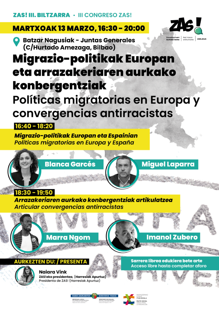 III Congreso ZAS!Por f0pqrvoeaxwe / marzo 7, 2024 III Congreso ZAS! – Políticas migratorias en Europa y convergencias antirracistas El próximo 13 de marzo, de 16:30 a 18:00, en Juntas Generales, se celebrará el III. Congreso ZAS! ¡Entrada libre hasta completar aforo.
