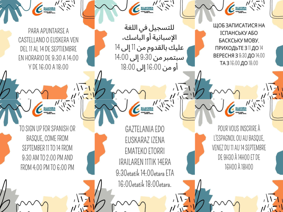 En el mes de octubre empezamos de nuevo las clases de castellano y euskera en la Fundación Ellacuría. Apúntate los días 11, 12, 13 ó 14 de septiembre de 9.30 a 14h o de 16 a 18h en la sede de la Fundación.