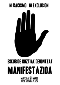 El próximo día 21 de marzo a las 19:30 horas, desde la #PlazaArriaga, se realizará una manifestación pública, convocada por SOS Racismo, en contra del Racismo y Xenofobia, e invitamos a todas las personas de cualquier origen, a sumarse a esta actividad pública de apoyo a la convivencia desde la #dignidad y los #derechos de todas las personas. Participa y Difunde!!