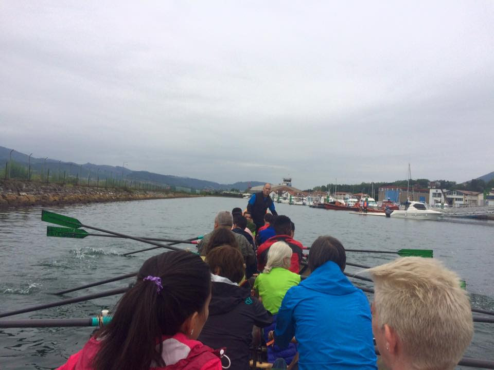 Por la tarde llegamos a Hondarribia. El Concejal de Deportes y Cultura del Hondarribiko Udala, Kalixa, experto remero y campeón de trainera nos enseñó los trucos para remar todos a una. No fue fácil pero la diversión estuvo asegurada. En el Ayuntamiento nos recibieron con todos los honores, los jóvenes se sentidieron muy bien acogidos y compartimos las ilusiones de esta travesía. Después de una excelente visita guiada, fuimosrecibidos con todos los honores en la Sociedad Klink Elkartea, con un baile Agurra de bienvenida y un coro que nos puso los pelos de punta con canciones tradicionales. La cena que nos ofrecieron fue tan increíble como el recibimiento.