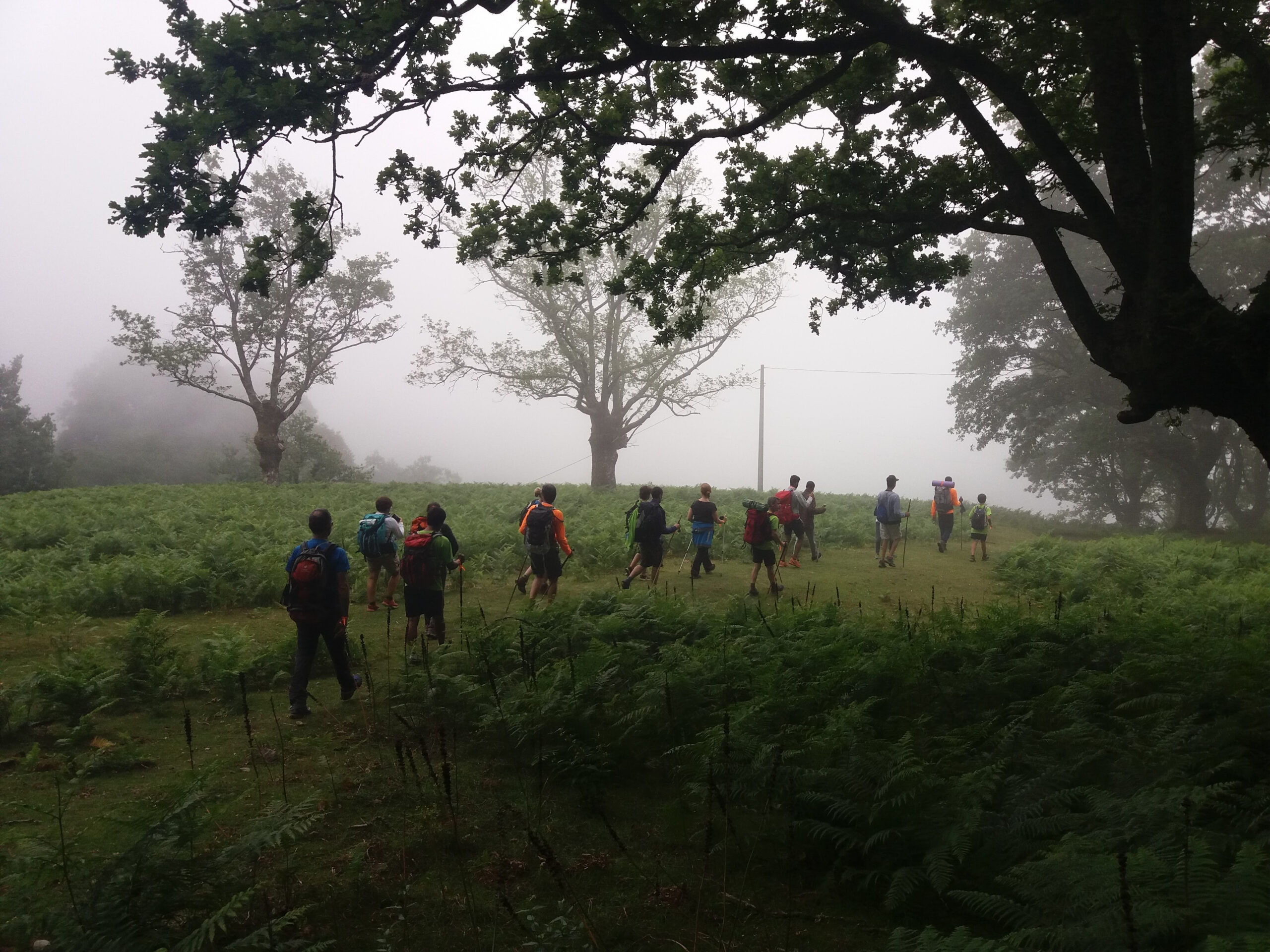 Salimos de Bera hacía Elizondo y ya en el monte Santa Bárbara descubrimos que el cansancio podría ser fuerte ese día. Fue una etapa larga en la que el calor se apuntó por momento pero fue mitigado por la niebla. Durante todo el recorrido fuimos acompañados por los voluntarios de la Cruz Roja Navarra y el equipo terrestre. A pesar del cansancio disfrutamos de los paisajes increíbles de Bera, Etxalar y Baztán. En Elizondo, capital del Valle, fuimos acogidos por la gente de Malkorra que nos invitó a cenar en la sociedad del pueblo. Fue un momento de encuentro entrañable que contribuyó a reforzar nuestra ya vieja amistad. Antes de cenar, Joseba, Alcalde del valle, nos estuvo explicando la historia y costumbres del valle. Esker mile aunitz Baztango bailara, benetan, esker mile!